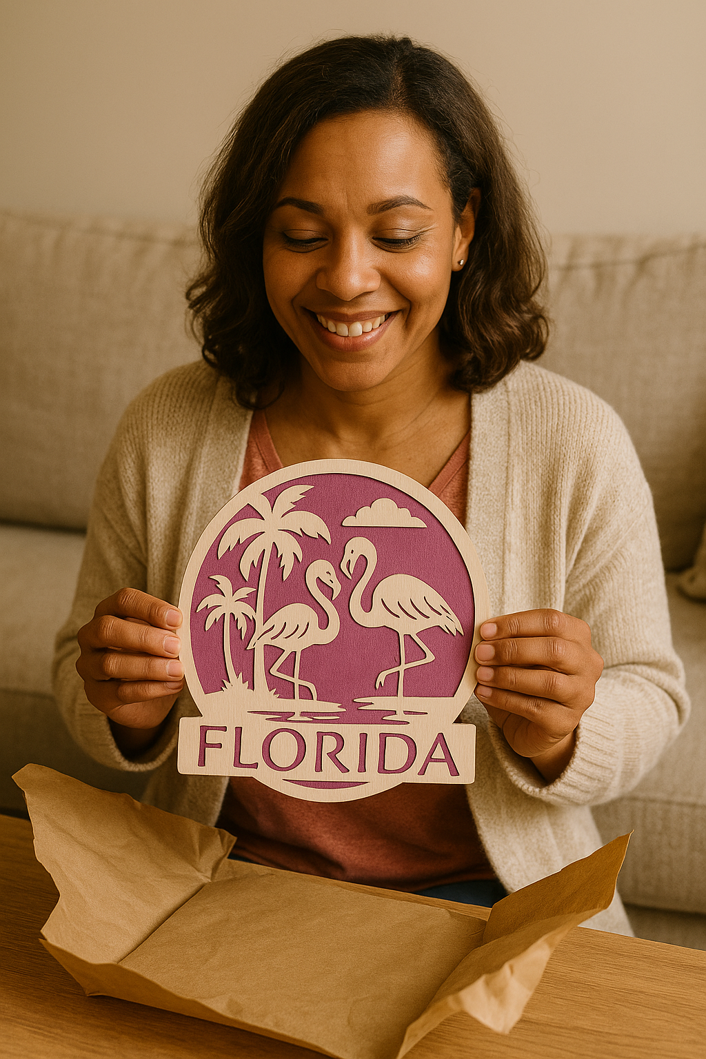 Bring a touch of tropical paradise into your home with this beautifully crafted Florida Flamingo Wall Sign. Made from precision-cut wood and featuring a vibrant pink background, this interior décor piece showcases two elegant flamingos standing beneath swaying palm trees and a serene cloud. The bold “FLORIDA” lettering adds a charming, vacation-ready vibe that’s perfect for any beach house, sunroom, or coastal-themed space.