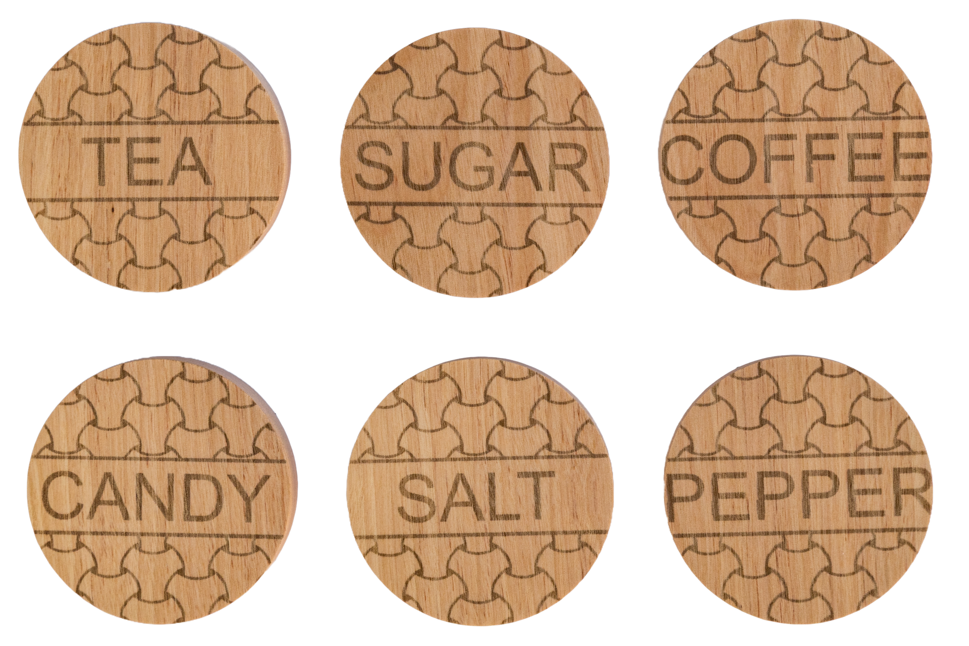 Organize your pantry in style with this 6-Piece Set of Laser Engraved Wooden Mason Jar Lids. Designed to fit standard small-mouth mason jars, each lid is precision-cut from durable hardwood and engraved with a decorative puzzle pattern and labeled for common kitchen staples: Tea, Sugar, Coffee, Candy, Salt, and Pepper. Customize the text to suite your needs.